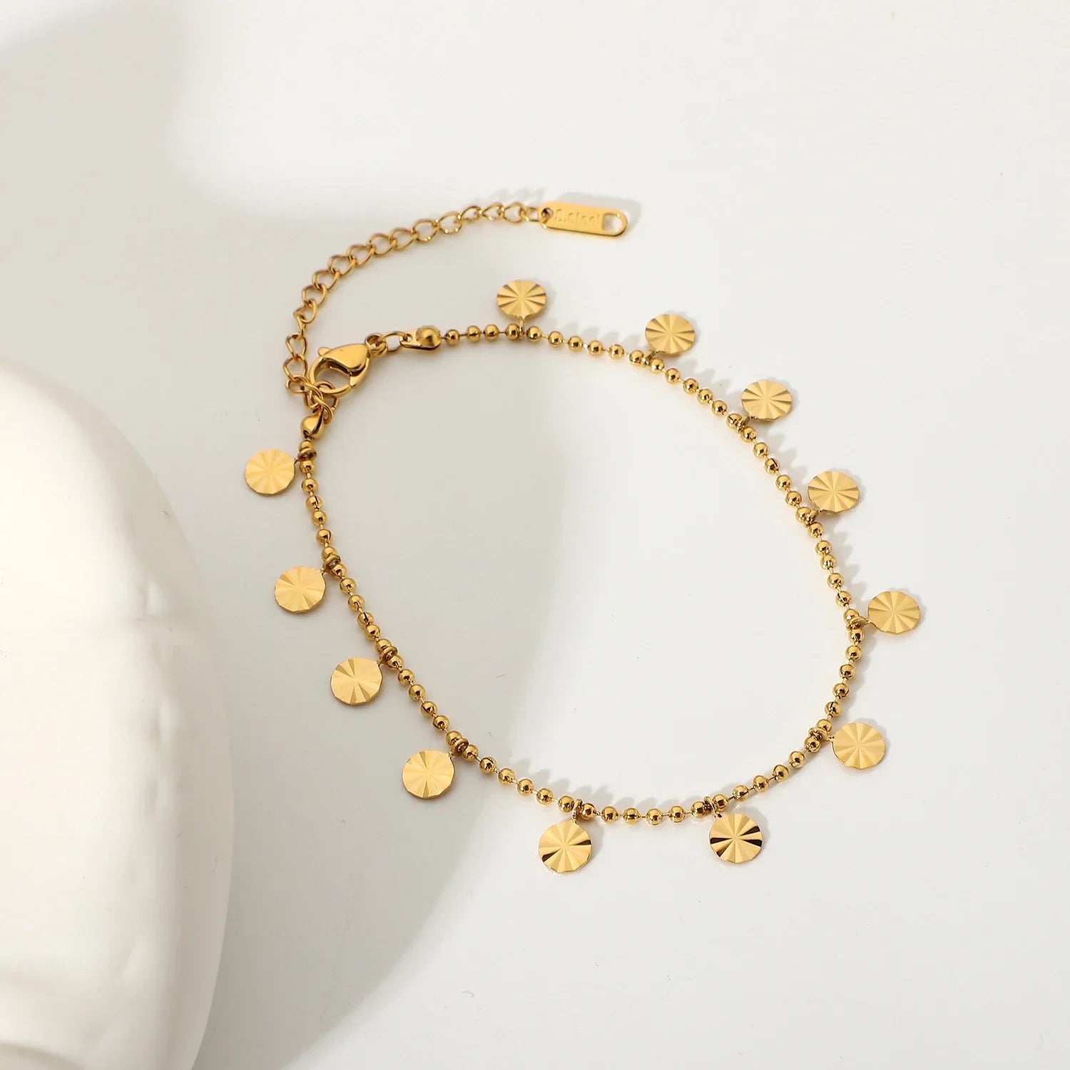 Elevate your style with the Shimmer Disc Anklet, a timeless accessory perfect for any occasion. Crafted from high-quality stainless steel and finished with a brilliant Gold plating, this anklet features dainty circular discs that add a touch of elegance to any outfit. Designed for comfort and durability, it’s the ideal everyday piece that radiates sophistication.